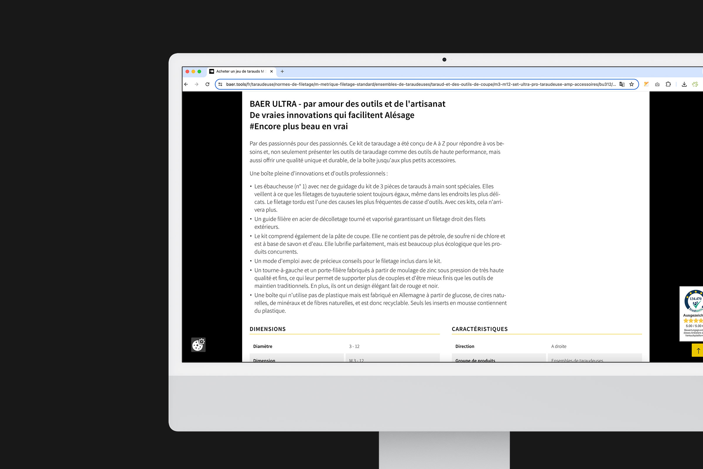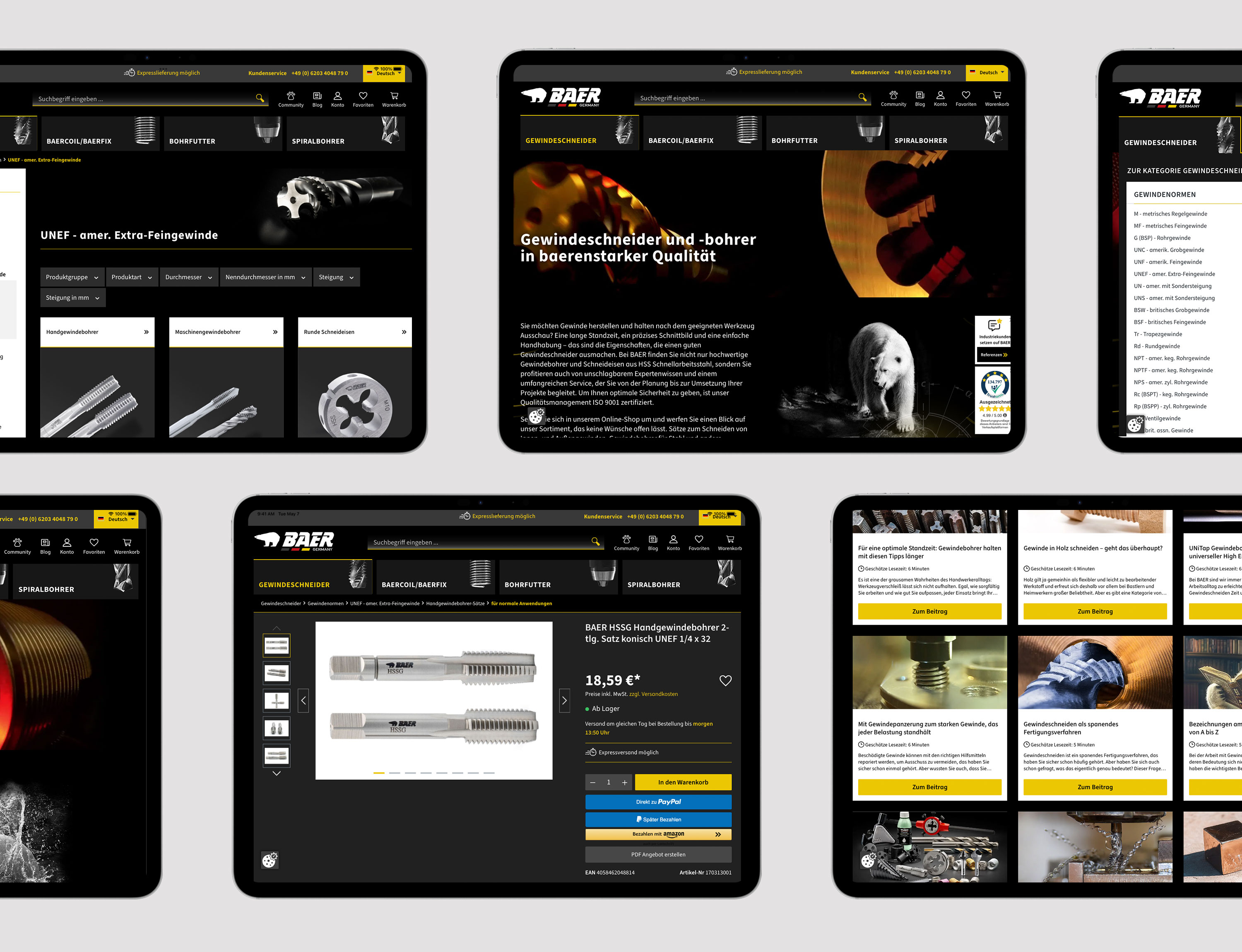 Der Onlineshop von BAER Tools besticht durch sein klares Design, das selbst bei einer Vielzahl von Navigationsebenen stets für Übersicht sorgt. Intuitive Benutzerführung und durchdachte Layouts ermöglichen es, das umfangreiche Sortiment mühelos zu durchstöbern. Mithilfe einer klar strukturierten Menüführung navigiert man schnell zu den gewünschten Produkten. Die Kombination aus ansprechender Optik und funktionaler Gestaltung sorgt für ein angenehmes Kauferlebnis.