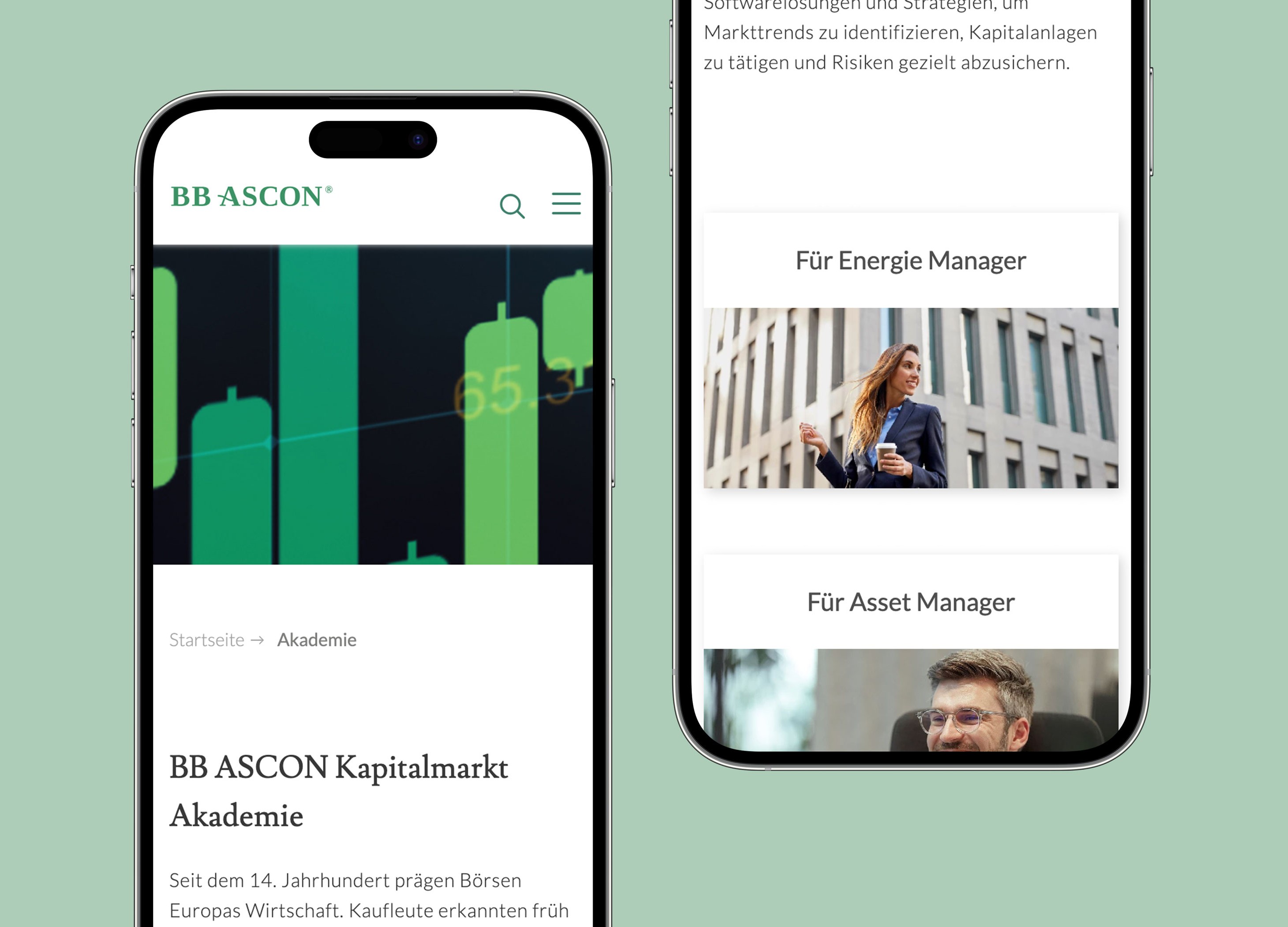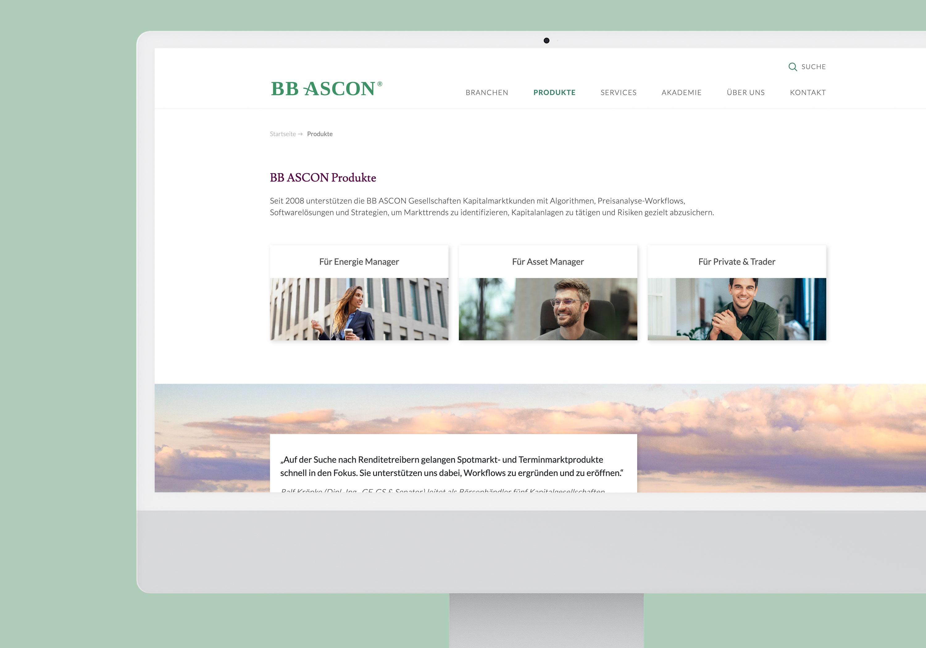 Wir haben das Corporate Design von BB ASCON neu justiert – mit einem überarbeiteten Logo, einer fokussierten Farbwelt und einer Bildsprache, die die Dynamik der Märkte ebenso einfängt wie die Seriosität des Unternehmens.